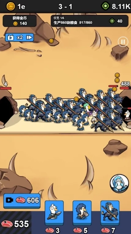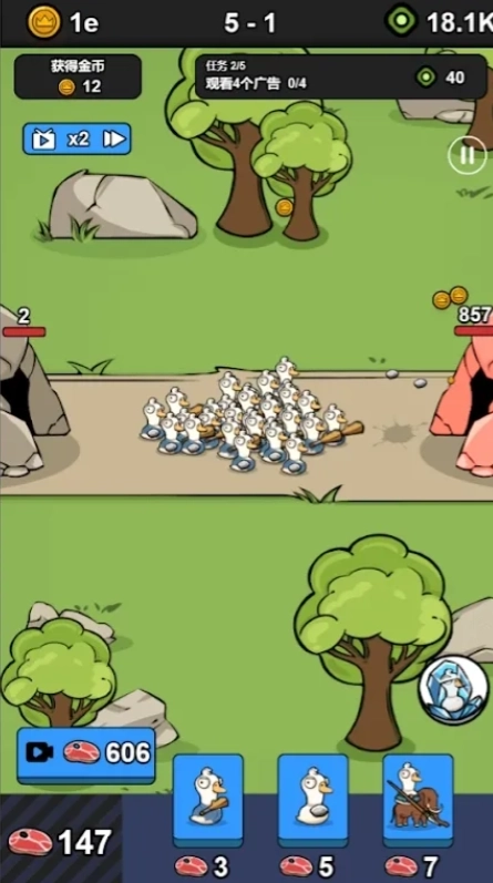 1、游戏初始阶段,玩家需收集食物资源,召唤更多鹅战士,与敌人进行决斗;若取得胜利,便能解锁并进入下一个文明时代。