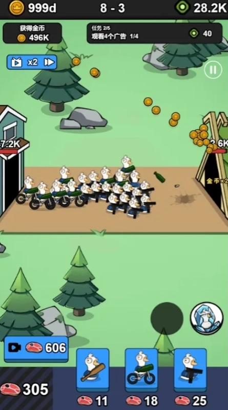 2、每个时代都有别具一格的鹅鸭战士可供解锁、装扮与武装,从弓箭手到机械化战士,它们各有特色,正等待着你的指挥。