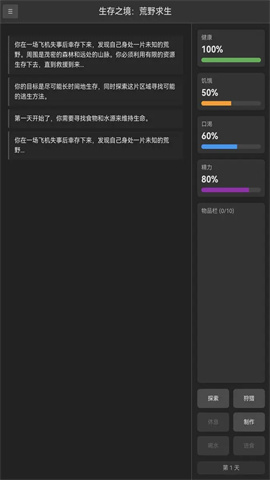 生存之境荒野求生手机版是星语工作室推出的一款生存冒险游戏,玩家的健康、饥饿、口渴、精力等生存状态,会以百分比进度条的形式在屏幕右侧展示。游戏里,玩家收集到的各类资源均存储于物品栏中,相关信息都通过文字来呈现。借助屏幕右下角的选项,玩家能够选择不同的生存行动以获取资源,游戏还会同步记录生存的天数。