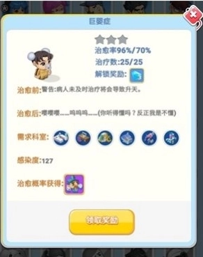 《萌趣医院》在最近的版本更新里新增了病人图鉴系统,图鉴中收录了所有病症的详细说明,同时还能查询到每个病症对应的治愈率和治疗人数。玩家持续治疗病人的过程中,将逐步解锁不同星级的治疗奖励。