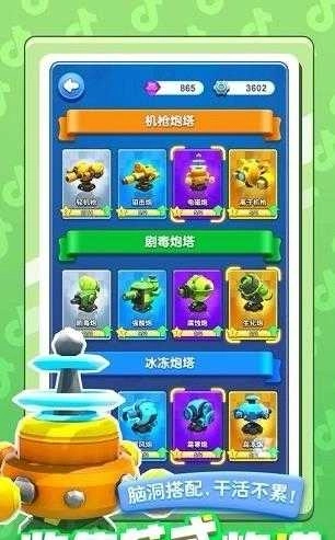 2、各式各样的炮塔依次登场,它们功能各不相同,机枪、狙击、电磁、瘟疫、冰冻、核弹等每一种炮塔都有着独特的效果,各有各的奇妙作用。