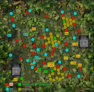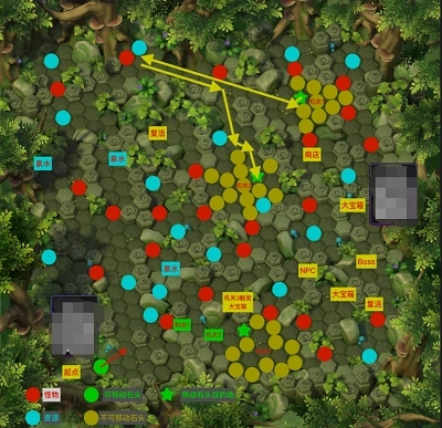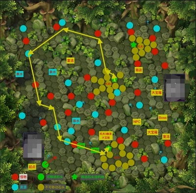这幅图展示了NPC、资源、怪物和Boss的分布情况。图中,红色圆圈代表怪物,蓝色圆圈代表资源,绿色圆圈则是可移动石头。这块石头是图中的关键元素,能够用来解锁图中所示的三个石头阵。