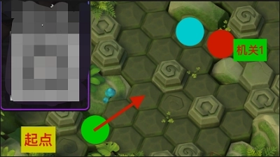 1、在起点处,沿着红线和黄线的路径推动石头,就能把它送到机关1旁的星星位置;这个位置对应三角石阵的触发点,当三角石阵完成后会出现一个机关——我把它编号为机关1,它正是通往最终Boss通道的关键机关所在处。