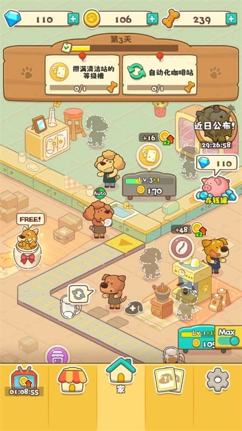 3、完成任务能让我们得到钻石,用这些钻石就能解锁更多小狗伙伴啦~小狗数量增多后,还能实现饮料的自动化生产哦!