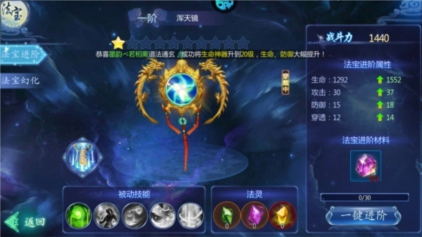 3、对法宝进阶能够大幅提升游戏角色基础属性。