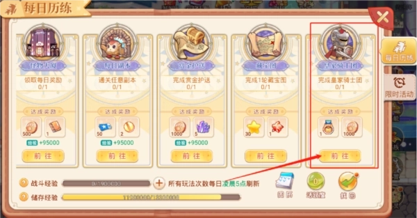 角色达到90级后将解锁「皇家骑士团」玩法,该玩法的入口可在玩法界面的每日历练板块中找到。