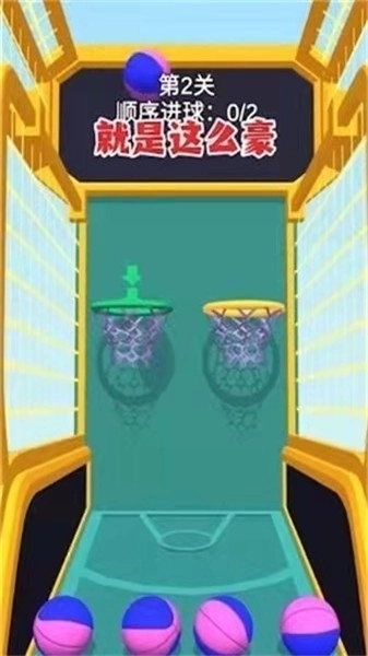 1、这款游戏的玩法十分简单,想必不少玩家在现实里也爱打篮球吧——游戏里就是把篮球投进篮筐来计分,等分数攒够关卡的通关标准,就能顺利过关啦!