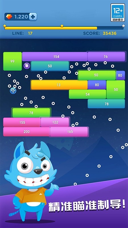 3、玩家可以用手指按住屏幕来瞄准目标,同时更要充分运用自己的大脑,仔细思考不同难度级别的特点,让每个球球都能精准射击,从而快速消灭所有方块。