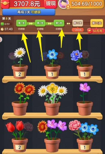 2、同一花盆里若出现三个相同颜色的花朵,它们便会自动组合成花束,从而完成消除。