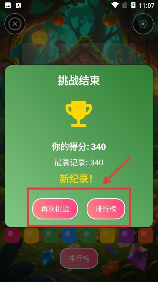 4、挑战结束后,若刷新了新纪录,既可以选择【再次挑战】继续游戏,也能够点击【排行榜】查看排名情况。