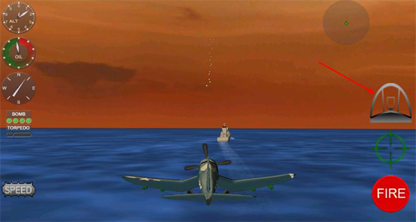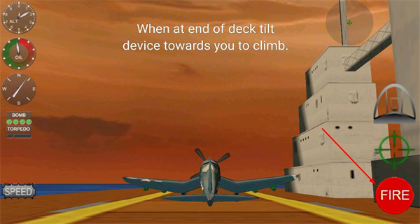 3、进入任务界面后,会看到操作提示:当到达甲板尽头时,需倾斜设备完成爬升,随后点击开火按钮即可执行起飞操作。