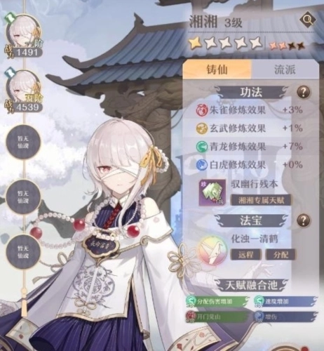 从角色特性来看,湘湘具备水系与符咒效果各提升20%的加成,无疑是该位置的理想选择。她的功法修炼对青龙、朱雀有着天然的增幅,能让角色成长效率大幅提升。专属天赋“驭幽行残本”效果直接,可增强伤害技能的威力;法宝“化浊—清鹤”则是大范围伤害技能。融合天赋池中,除天赋2为移速加成外,其余均为伤害提升类效果,特别是在法力值满额时,还能额外增加爆伤,让初始输出能力极为强劲。