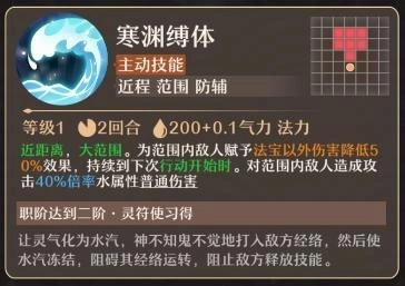 寒渊缚体(主动技能):该技能为近距离、大范围生效的类型。它会让范围内的敌人获得“法宝以外伤害降低50%”的效果,此效果将持续至敌人下次行动开始。同时,技能还会对范围内的敌人造成相当于自身攻击40%倍率的水属性普通伤害。