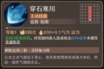 穿石寒川(主动技能):作用范围为直线4距离。对该范围内的敌人,造成相当于自身攻击力60%倍率的水属性普通伤害。