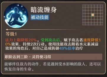 暗流缠身(被动技能):法力上限减少20%。受到攻击时,会让攻击者获得速度降低10%的效果,该效果持续2次行动。当使用技能攻击带有水元素减益的角色后,将为自身恢复相当于防御49%倍率的生命值。