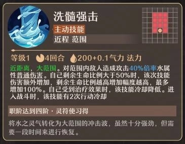 洗髓强击(主动技能):近距离、大范围释放。对范围内敌人造成攻击力40%倍率的水属性普通伤害。当自身剩余生命比例超过50%时,本次技能伤害会额外提升,剩余生命比例越高,伤害增幅越大,最高可增加100%。自身获得治疗效果时,该技能的冷却时间会缩短。进入战斗状态时,该技能初始有2次行动冷却。