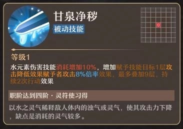 甘泉净秽(被动技能):使用水元素伤害技能时,消耗提升10%;同时,会为技能目标附加1层攻击降低效果,该效果的数值基于赋予者攻击的8%,最多可叠加至9层,效果持续目标的2次行动。