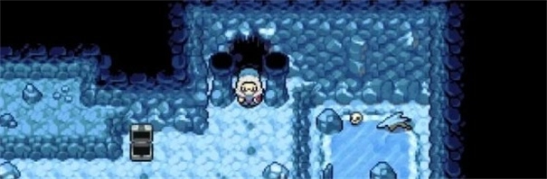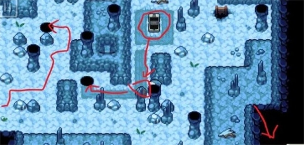 还是第三层,最下方的冰场起初无法通行,走右侧的梯子上去后会看到一个箱子,将技能切换为“推”,按照图示把石头推下去,就能通过第三层的冰场了。