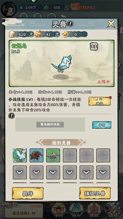 4、玩家在获得灵兽后,可借助灵兽口袋对其进行升级,等级提升后能显著增强攻击属性;