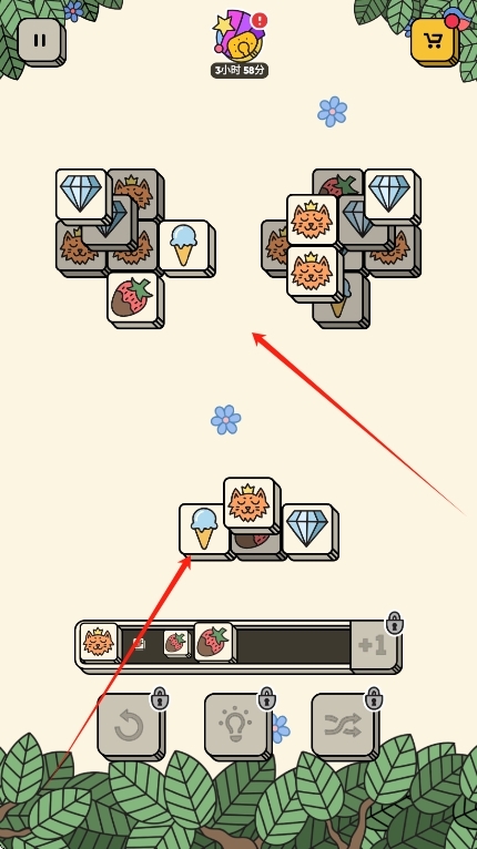 1、基础消除玩法:点击相同图案的方块使其堆叠,每凑够三个一组就会自动消除并累计得分,堆叠的方块数量最多不能超过七个,要是连续七步都没能完成消除就会挑战失败。