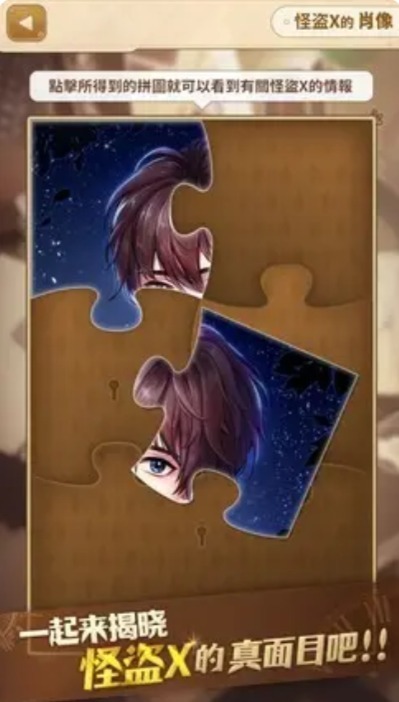 然后他们锁定了三个怀疑对象,侦探小姐需要对这几个人展开调查。只有先攻略完这三个人,才能去攻略怪盗叉。另外游戏里有一张怪盗叉的肖像图,每达成一个结局就能获得一块拼图,总共需要五块——也就是说,攻略完四个人之后,还得再打一次谁也不攻略的普通结局才行。而且怪盗叉的好感度如果没到一百的话,根本没法进入结局(这设定真是让人头疼啊……)