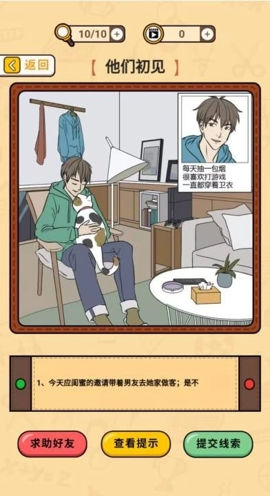 这是一款以物品搜寻与解谜为核心的游戏,玩家将化身为解谜达人,在各个场景里找出不合常理之处,挖掘隐藏的线索,以此判断男友是否存在欺骗行为。游戏的所有操作都通过点击和滑动即可完成。