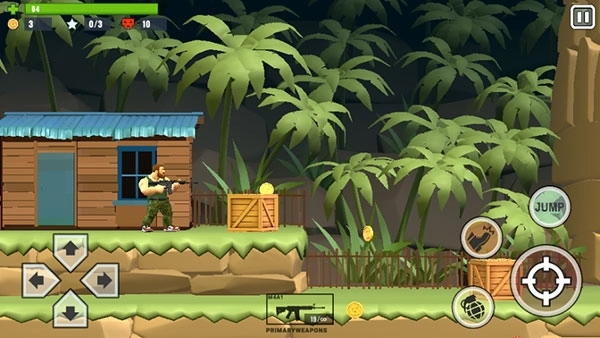 使用左侧轮盘操控角色移动,右侧按钮依次负责跳跃、踢打、投掷手雷与射击操作。