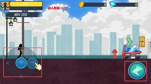 1、战斗环节采用纯按键操作设计,左下方负责控制角色移动,右下方配备出拳、踢腿和跳跃功能,技能衔接流畅自然,使玩家能充分体验格斗的节奏与趣味。