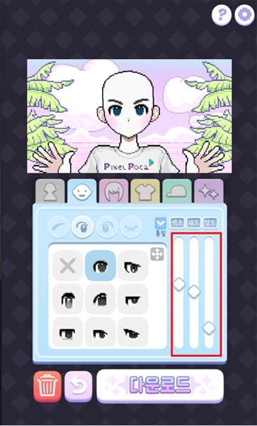 4、在选择眼睛的框架中,拖动右侧的滑竿能够调整眼球的颜色、亮度等参数