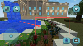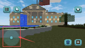 2、观察像素风格的建筑画面,点击左下角红框内的圆形物体,该操作大概率是针对建筑前方的水池区域进行的。