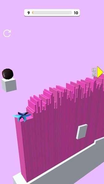 切倒一切是一个图片新鲜的切片解压游。游戏中可以解锁菜刀、剪刀、电锯、剑、飞镖等不同的武器。要体验,把竖起的挡板切开,切一条平整的路,让球顺着路滚下去,在终点线穿过圆圈。球滚得越远,奖励越高。
