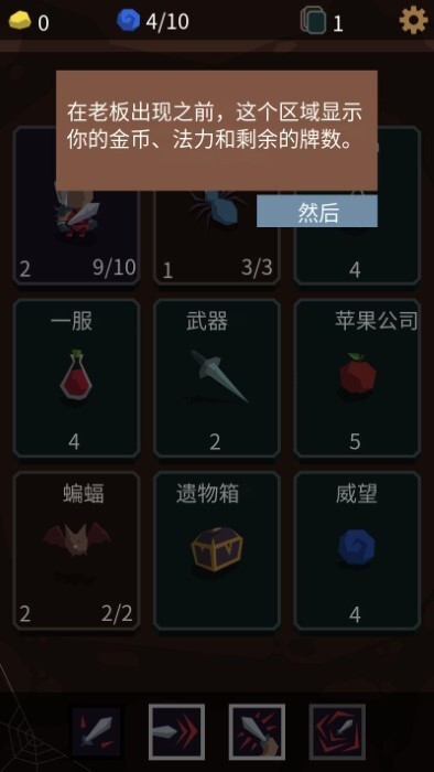 在首领出现之前,你可以在上方看到自己的金币数量、法力值以及剩余的牌数。