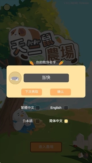 1、游戏启动后,先给你的牧场起一个独特又悦耳的名字,就此开启专属于你的天竺鼠庄园生活吧!
