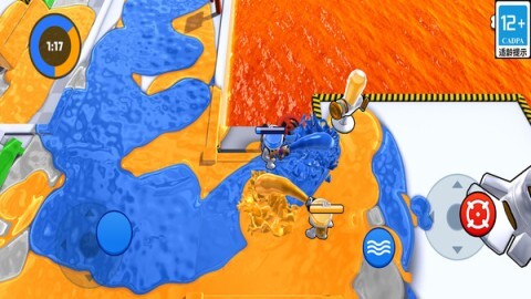 2. 点击右下角那个红色的瞄准按钮就能发射水枪,喷射出的颜料会覆盖地面,起到压制敌人的作用,进而逐步抢占战斗空间。