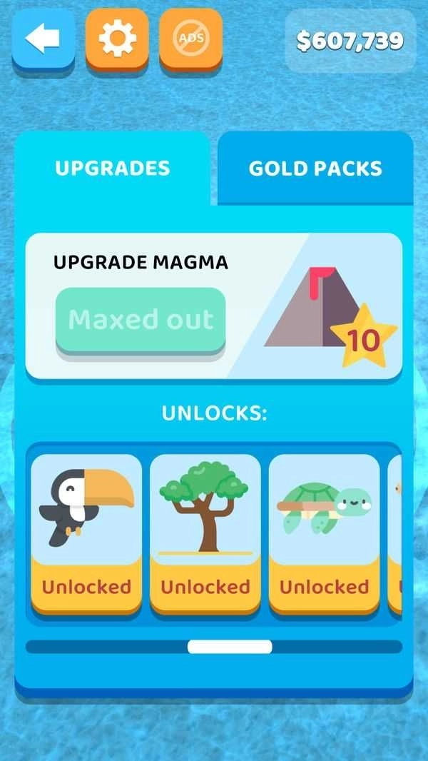 1、创造一个非常可爱的卡通的火山小岛,解锁各种绿色的树木和植物,很好玩的;