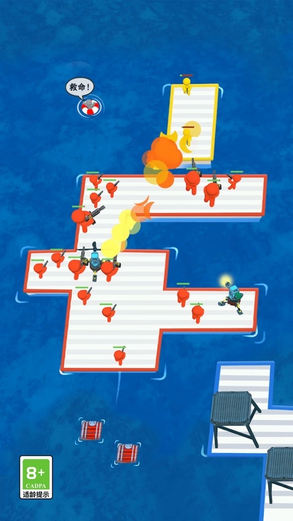 2、注意观察海面的漂浮物,把各种方块和人员都收集起来。方块可以用来搭建、拓展岛屿,人员会加入队伍,增强整体的战斗能力。