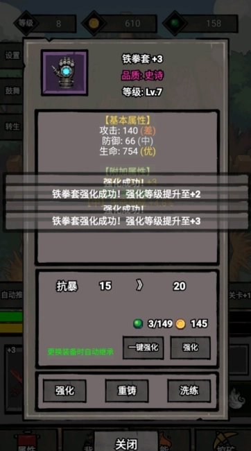 3、要是在这个过程里遇到卡关卡的情况,玩家可以通过强化装备来提升战力,后续还能对装备进行重铸与洗练操作。