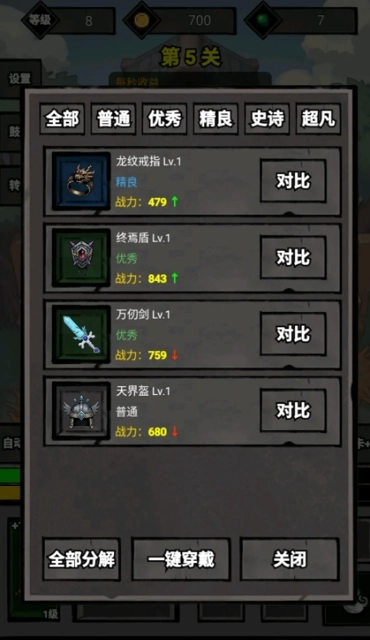 2、游戏挂机时,玩家可以查看背包,里面有挂机战斗获得的装备。前期没什么需要特别注意的,直接选择一键穿戴即可,系统会自动为玩家穿上等级更高、战力更强的装备。