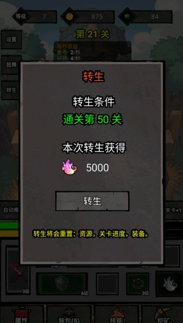 6、当玩家推进到第50关后,即可开启转生功能。完成转生操作后,玩家将得到5000奖励点,该奖励点可用于购买战斗中所需的各类属性加成。