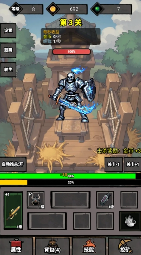 4、到了中间阶段,玩家会察觉到自己打不动怪物了。这时可以关闭自动推关功能,停留在角色能够战胜怪物的关卡,通过挂机来刷取金币和经验。