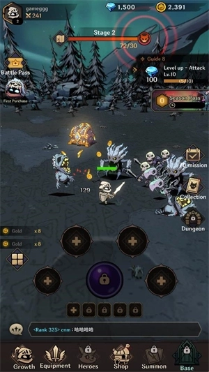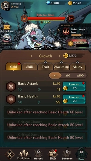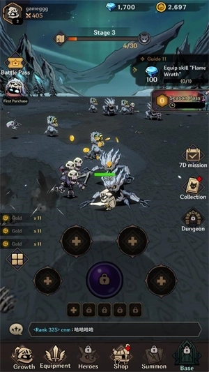 2、击败怪物可获得金币奖励,点击下方的Growth按钮能提升属性,每次提升都要消耗金币。