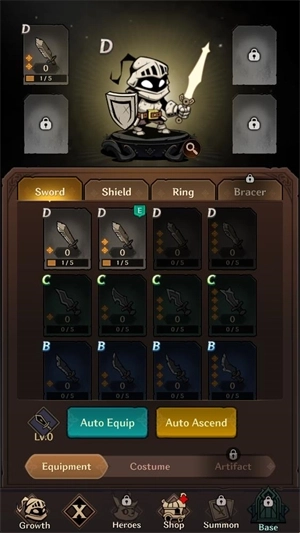 3、点击Equipment按钮可以为你的角色搭配不同的装备,同品质下星星越多的装备属性越好。