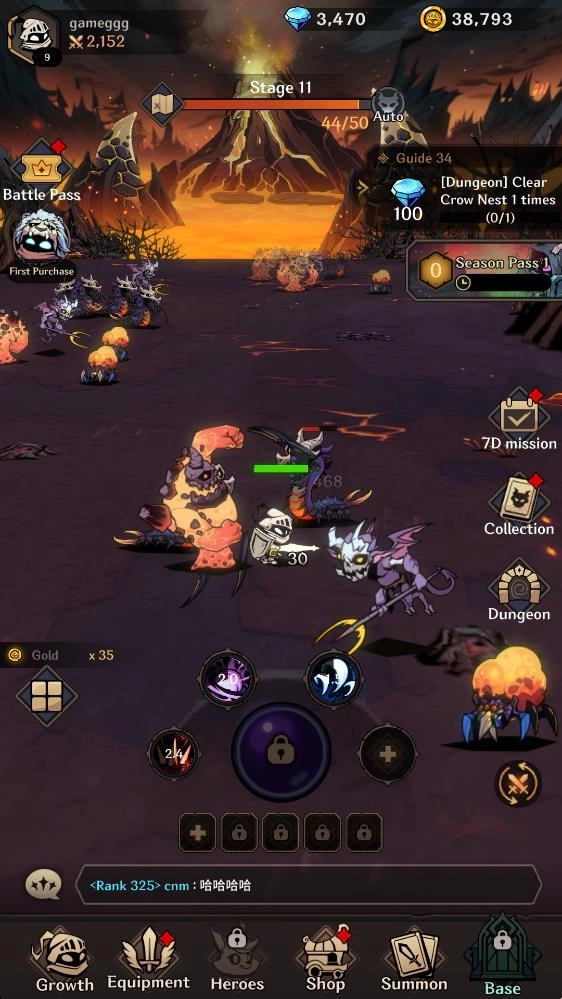 1、进入游戏后,通过滑动屏幕能够操控角色移动,角色会主动攻击周围的怪物。