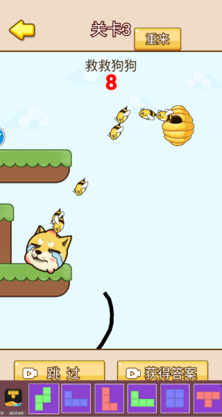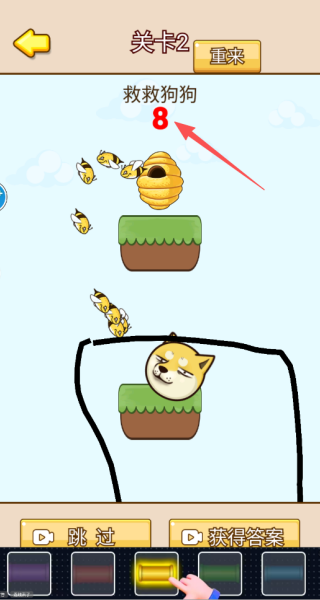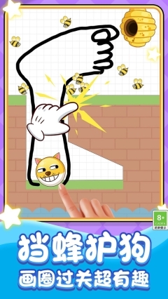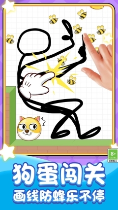 1、用手指在屏幕上画线条搭建防护屏障,保证蜜蜂没办法碰到中间的狗头角色。