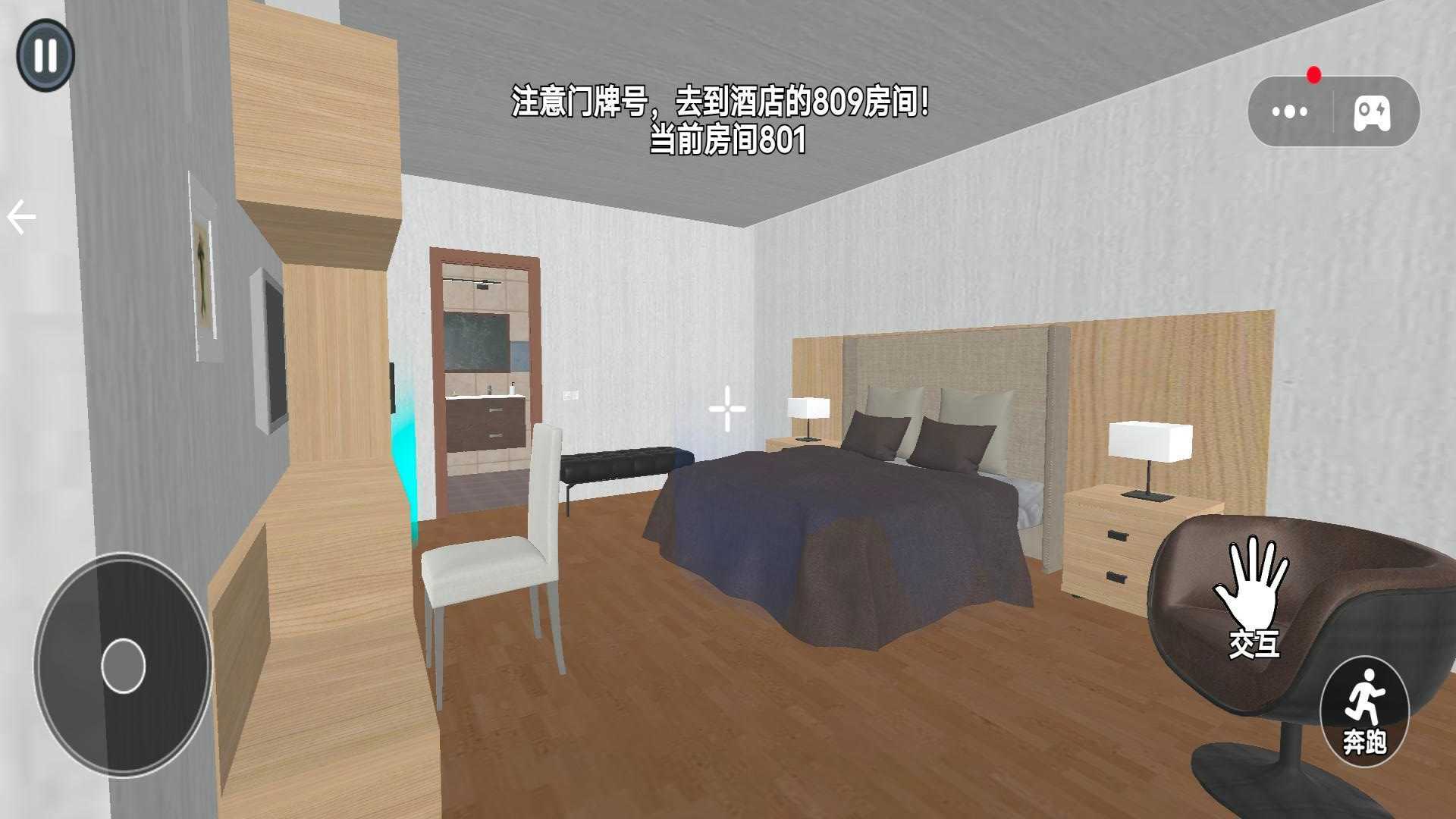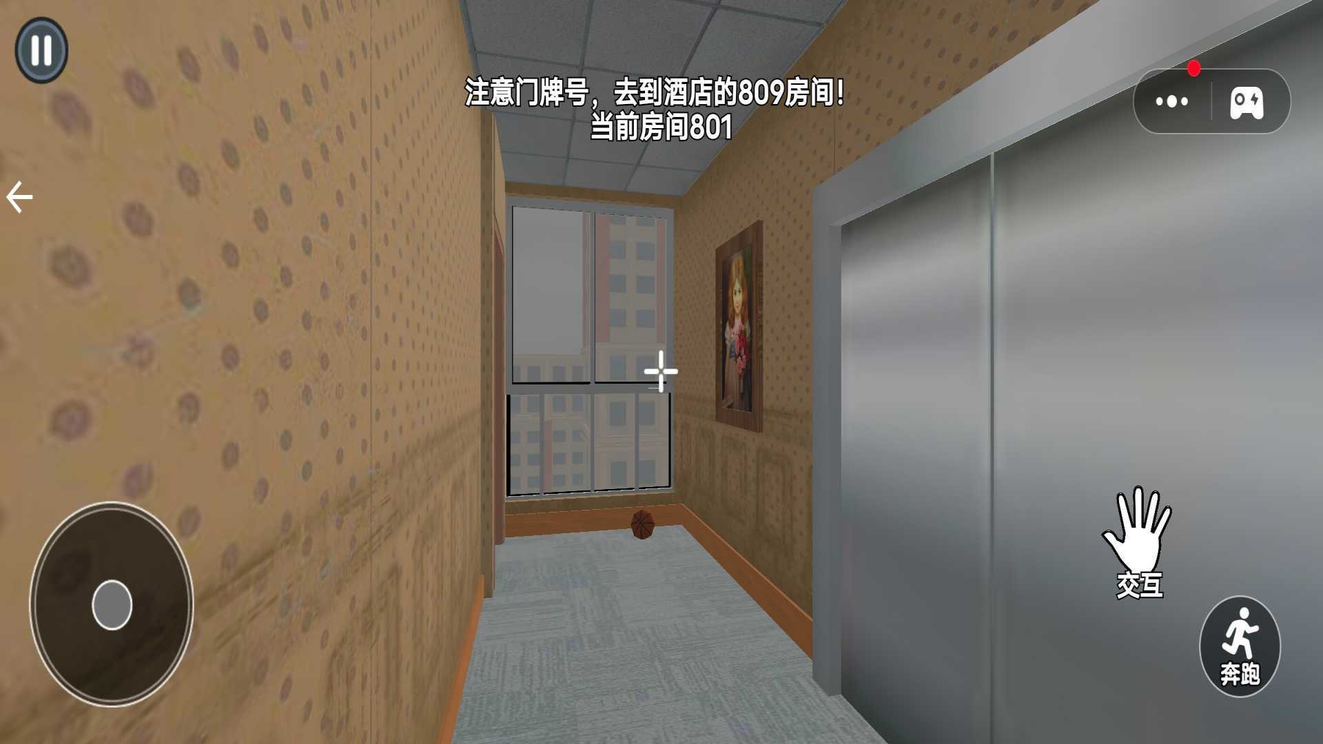 3、操控角色时,通过左侧圆盘进行移动,借助右侧的“交互”与“奔跑”按键,去探寻场景中的诡异之处。