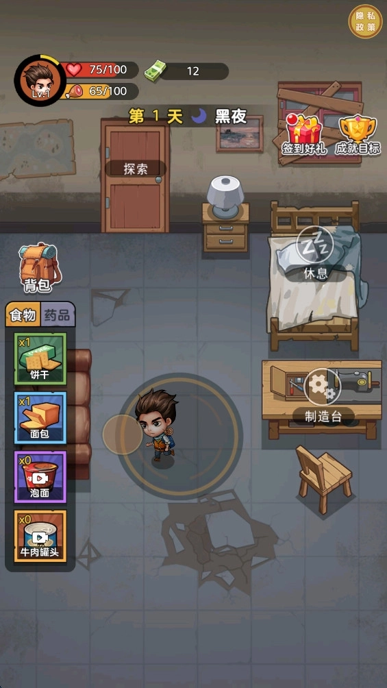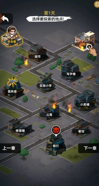 3.开启“第一天求生”任务后,点击【探索】按钮就能外出活动,在废墟里搜寻食物和武器,增强战斗力来抵御丧尸的攻击。