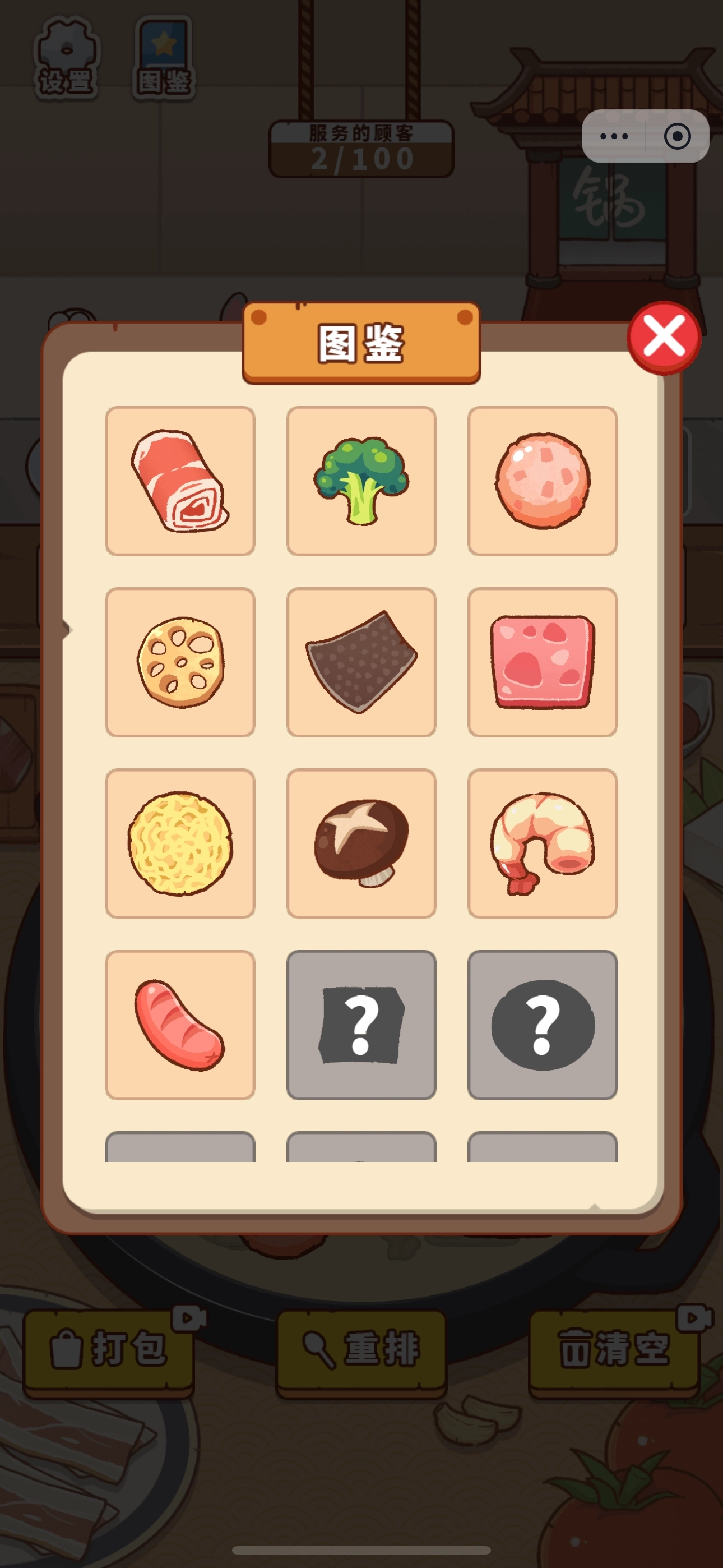 1、玩家需要点击食材,使三个相同的菜品浮到汤面,然后供给顾客。