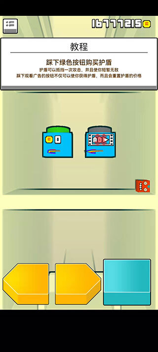 7、按下绿色按钮可购买护盾,该护盾能抵挡一次攻击,并让你进入短暂无敌状态;按下观看广告的按钮,不仅能获取护盾,还会重置护盾的价格。