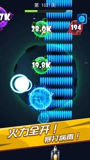 1、完成所有冒险关卡便能开启无尽射击模式,这里有超有趣的闯关玩法,每个病毒上都标注着攻击所需的次数,玩家可一定要注意别碰到病毒哦;