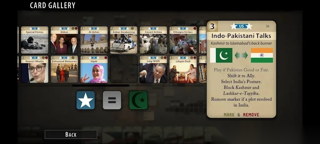 困境反恐战争游戏是一款深度策略模拟游戏,它以前中情局分析师的专业视角,还原出全球反恐战争的复杂格局。游戏采用卡牌驱动机制,玩家将在军事打击、外交斡旋与意识形态斗争等维度做出关键抉择,切身感受反恐战争里的艰难权衡与战略博弈。